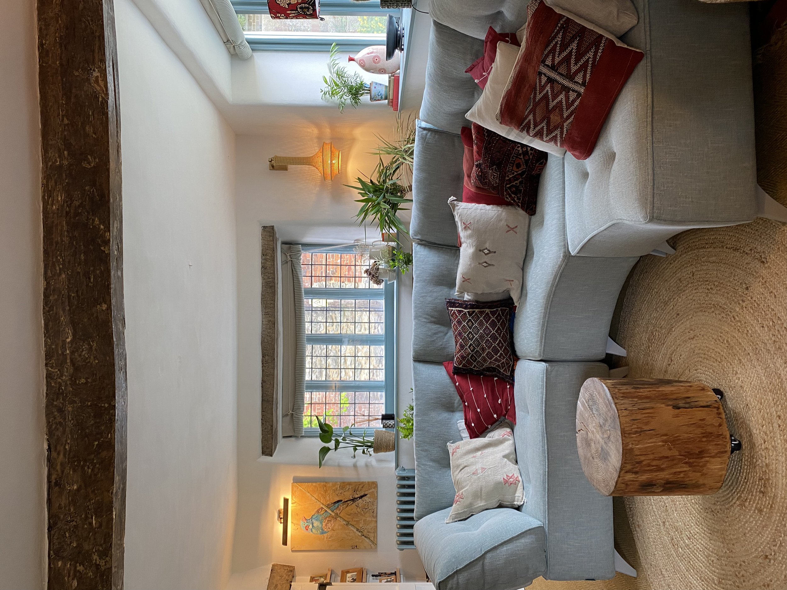 Living room with a white couch decorated with red and white patterned cushions, a large red and orange geometric patterned rug hanging on the wall, a wooden table, a window with a colorful floral lampshade, a plant in a black pot, and a beige basket,